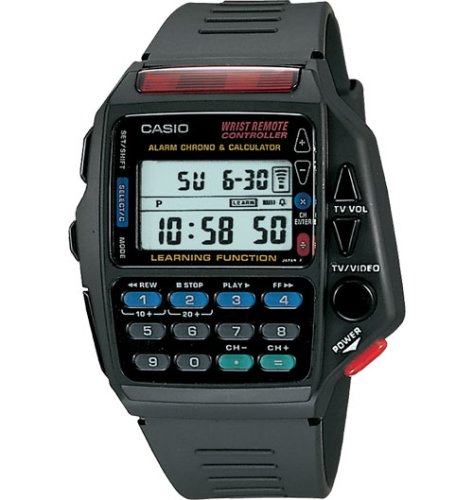 The Casio® Digital Calculator watch showcases a highly unique design which allows you to use the watch as a TV/Cable Box remote control; A learning function in the watch memorizes up to 16 sets of infrared data. The watch is also an 8-digit calculator and incorporates additional features such as a 1/100 second stopwatch, daily alarm, hourly time signal, and an auto-calendar.