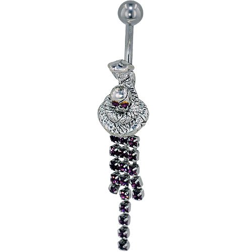 Belly button rings are one of America's hottest fashion trends, and the Pugster Purple Crystal Cobra and Skull Belly Button Ring is one of the hottest around. This agressive navel ring features a silver tone cobra wrapped around a purple-eyed skull, ready to strike, and dangling three strands of purple Austrian crystal rhinestones. And with a 10mm 316 surgical steel curved barbell, this belly button ring will be both comfortable and stylish. Wear your belly button ring under your shirt as your own sexy secret, or let everyone see your navel decoration. Either way, your Pugster belly button ring is the perfect belly button ring for the job. Like all Pugster belly button rings, the Purple Crystal Cobra and Skull Belly Button Ring is available for both retail and wholesale purchase.