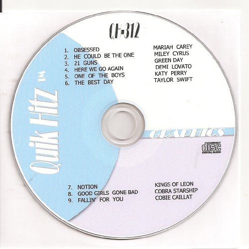 This listing is for a brand new QUIK HITZ Volume 312 Karaoke CD&G CD from the QUIK HITZ collection (QH-312). This CD comes packaged in a Plain Paper Jewel Sleeve with no artwork, plays the music without the lead vocals and displays the lyrics on a Karaoke CD&G player. These very good quality songs are professionally reproduced by studio musicians and are not performed by the original artist. There are no guide vocal tracks on these songs but there are Background vocals. The songs included are a listed: