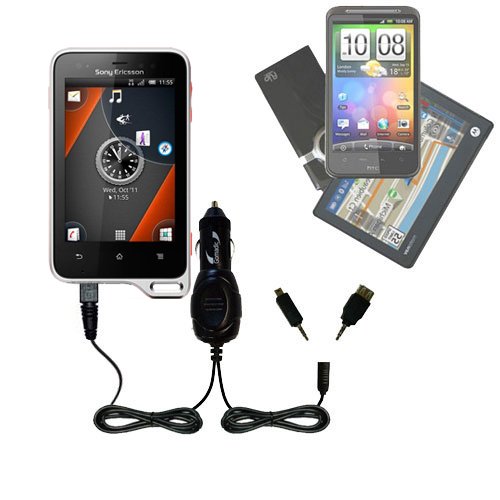 Split The Differences. Travel In Peace. No more arguments about whose device takes priority: whether you're on a road trip with your sales team or taking the family to the beach; Gomadic's Sony Ericsson Xperia active Rapid Dual Car Charger makes traveling fun again. Compatible with Gomadic's innovative TipExchange Technology that works with thousands of mobile devices; the Sony Ericsson Xperia active Dual Charger gives you limitless options for charging your tech on the go. Simply leave the charger intact and rotate your tech by plugging in the removable tips that are custom-made for all your devices. Just lock; load; and shuffle without any hassle or worse. Unleashing that tangle of superfluous wires that pollutes your travel space. Imagine a streamlined road trip where everyone gets what they want and you'll see the Sony Ericsson Xperia active Dual Charger resting confidently in your car's cigarette lighter. Take a business call or listen to a podcast while your son conquers Mars on his Play Station; and never run out of juice. No more cheap; single-purpose chargers falling from your car door. No more complex strategies for stretching power to the next destination. Split the differences by powering five; ten? two hundred? devices with one premium; fully functional cord and a few high-quality tips.Specifically designed to meet the proliferating and often contradictory needs of nomads across the globe; Gomadic brand Sony Ericsson Xperia active Dual Charger also allows you to charge double the devices in half the time; which translates to four times the power of shoddy; inefficient standard models. Take multitasking to the next level and enjoy all the versatility without sacrificing the high output wattage.