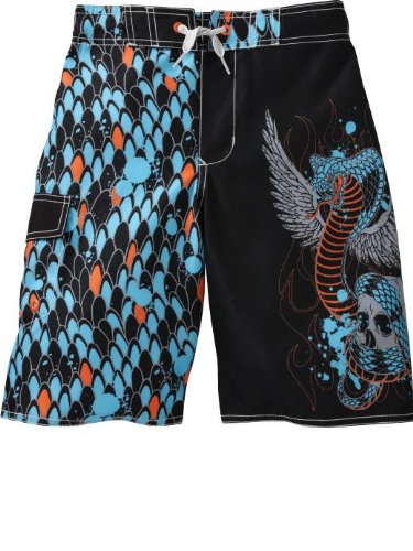 Old Navy boys swimwear. Only he can truly fathom how deeply cool these swim trunks are! Tattoo-inspired graphics, including a winged cobra, skull, scales and paint splatters add some serious edge, while the smooth, quick-drying shell keeps him comfortable in and out of the water. - Elasticized back waist with lace-up panel in front Faux fly Tattoo-inspired cobra, skull and scales graphics Single secure-flap cargo pocket with grommet drains at right leg Smooth, quick-drying shell Built-in mesh briefs