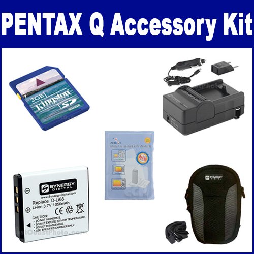 Pentax Q Digital Camera Digital Camera Accessory Kit includes the following items: 1) 8 Piece Digital Camera/Camcorder Deluxe Cleaning Kit 2) 2GB Standard Secure Digital (SD) Memory Card 3) VidPro CL-4 Medium Point & Shoot Film & Digital Camera Case, Black / Beige 4) D-Li68 Lithium-Ion Battery - Rechargeable Ultra High Capacity (1050 mAh) - replacement for Pentax D-Li68 & Fuji NP-50 Batterries 5) Mini Battery Charger Kit for Fuji NP-50, Pentax DLI68, Kodak K7004 Batteries - Fold-in Wall Plug (Car & EU Adapters Included)
