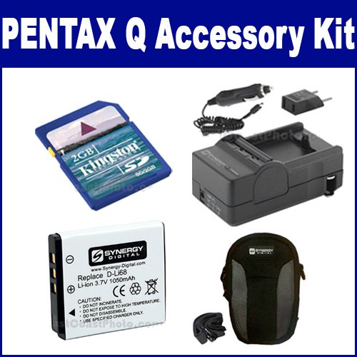 Pentax Q Digital Camera Digital Camera Accessory Kit includes the following items: 1) 2GB Standard Secure Digital (SD) Memory Card 2) VidPro CL-4 Medium Point & Shoot Film & Digital Camera Case, Black / Beige 3) D-Li68 Lithium-Ion Battery - Rechargeable Ultra High Capacity (1050 mAh) - replacement for Pentax D-Li68 & Fuji NP-50 Batterries 4) Mini Battery Charger Kit for Fuji NP-50, Pentax DLI68, Kodak K7004 Batteries - Fold-in Wall Plug (Car & EU Adapters Included)