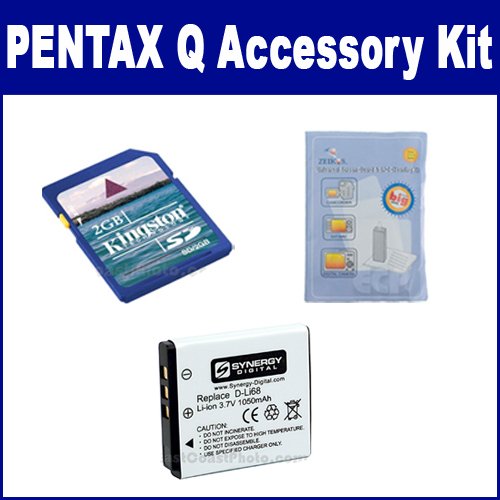 Pentax Q Digital Camera Digital Camera Accessory Kit includes the following items: 1) 8 Piece Digital Camera/Camcorder Deluxe Cleaning Kit 2) 2GB Standard Secure Digital (SD) Memory Card 3) D-Li68 Lithium-Ion Battery - Rechargeable Ultra High Capacity (1050 mAh) - replacement for Pentax D-Li68 & Fuji NP-50 Batterries