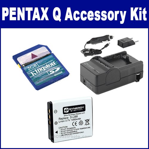 Pentax Q Digital Camera Digital Camera Accessory Kit includes the following items: 1) 2GB Standard Secure Digital (SD) Memory Card 2) D-Li68 Lithium-Ion Battery - Rechargeable Ultra High Capacity (1050 mAh) - replacement for Pentax D-Li68 & Fuji NP-50 Batterries 3) Mini Battery Charger Kit for Fuji NP-50, Pentax DLI68, Kodak K7004 Batteries - Fold-in Wall Plug (Car & EU Adapters Included)